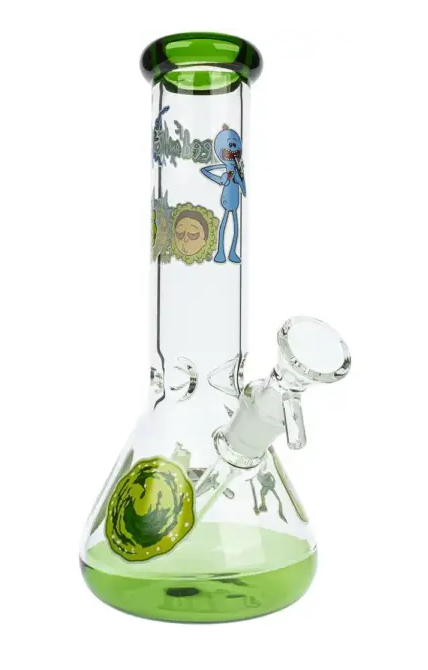 Enjoy your herbs with this cool Rick and Morty Beaker Bong. Covered in Rick and Morty graphics and featuring characters such as Mr. Meeseeks, Mr. Poopybutthole, and many more familiar scenes, this 8″ glass beaker bong is a great travel bong and a water pipe for parties. Graphics all around and green colored accents at the base and mouthpiece. Each bong includes a 3″ downstream and bowl combined.